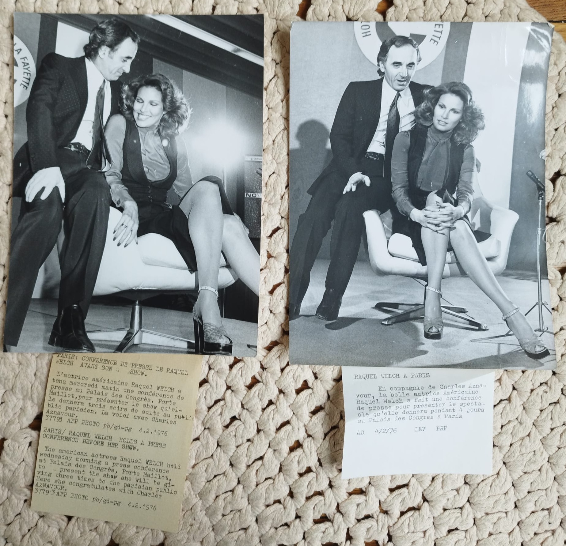 Deux tirages argentiques originaux en noir et blanc représentant Charles Aznavour et Raquel Welch.